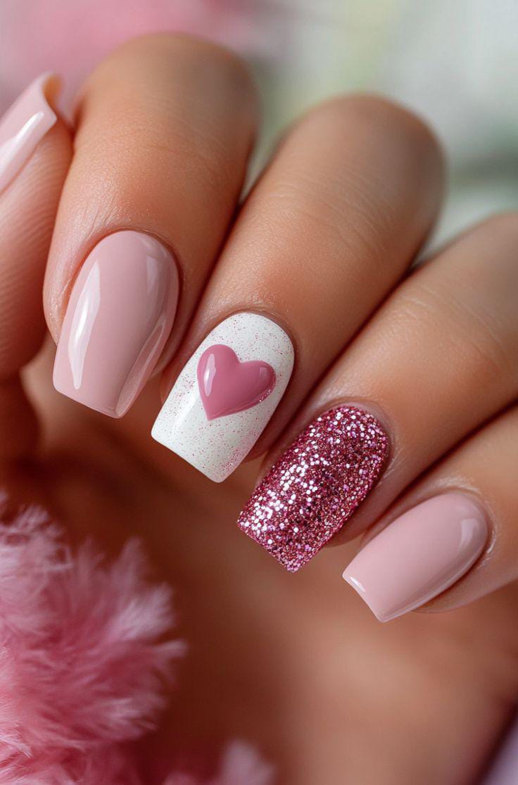 Glossy nude-pink nails highlighted by a white accent nail with a raised pink heart and a full glitter nail, giving a cute yet simple Valentine’s finish.