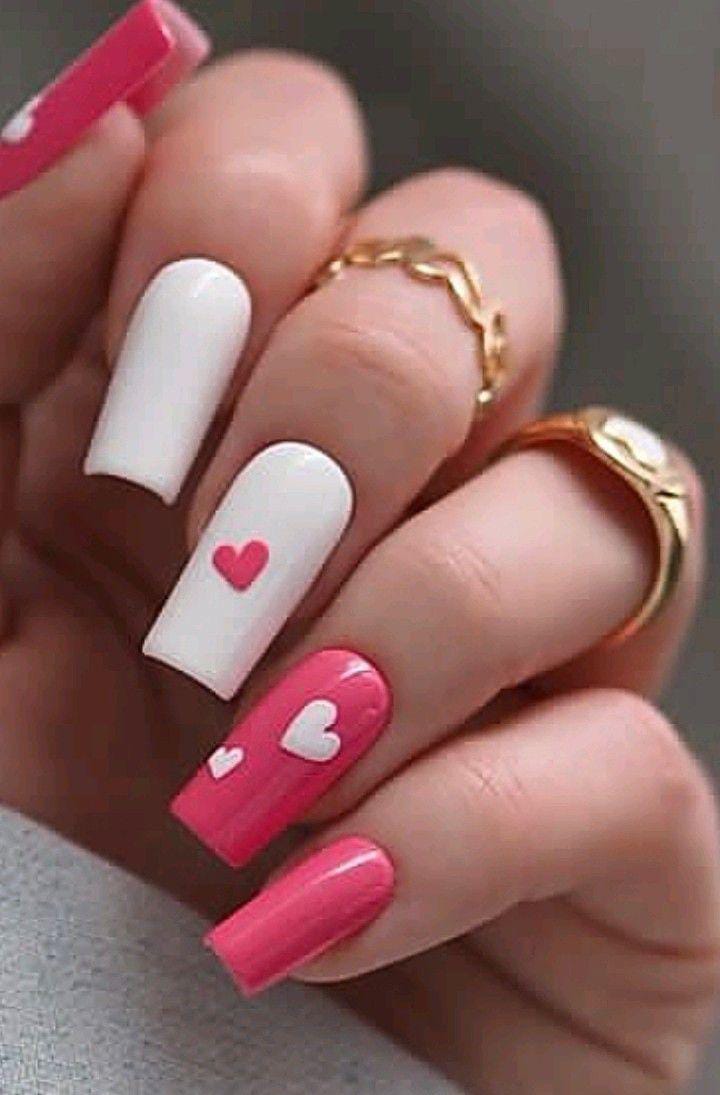 A mix of white and bright-pink nails decorated with small heart shapes, giving a fun, sweet, and simple Valentine’s aesthetic.