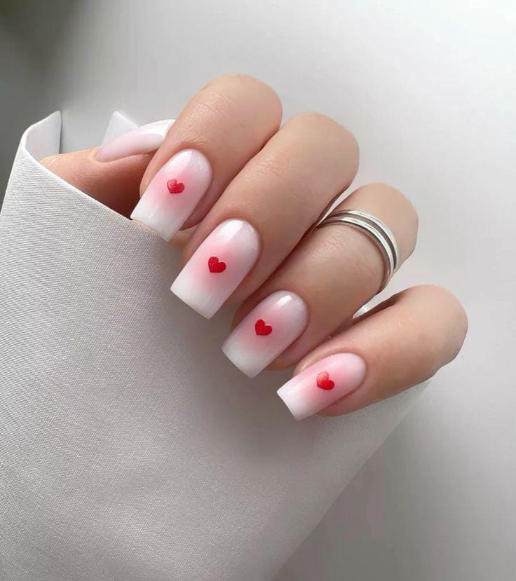 A soft pink-white ombré base with a single tiny red heart on each nail creates a clean, simple, and romantic look. The design feels soft, sweet, and effortlessly Valentine’s-ready.