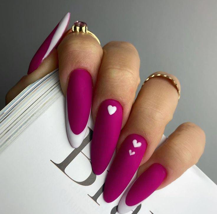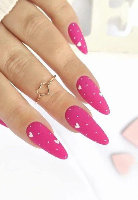 Bright matte pink nails are sprinkled with tiny white hearts and dots, giving a cute and lively Valentine’s feel. The long almond shape adds a fun, youthful simple touch.