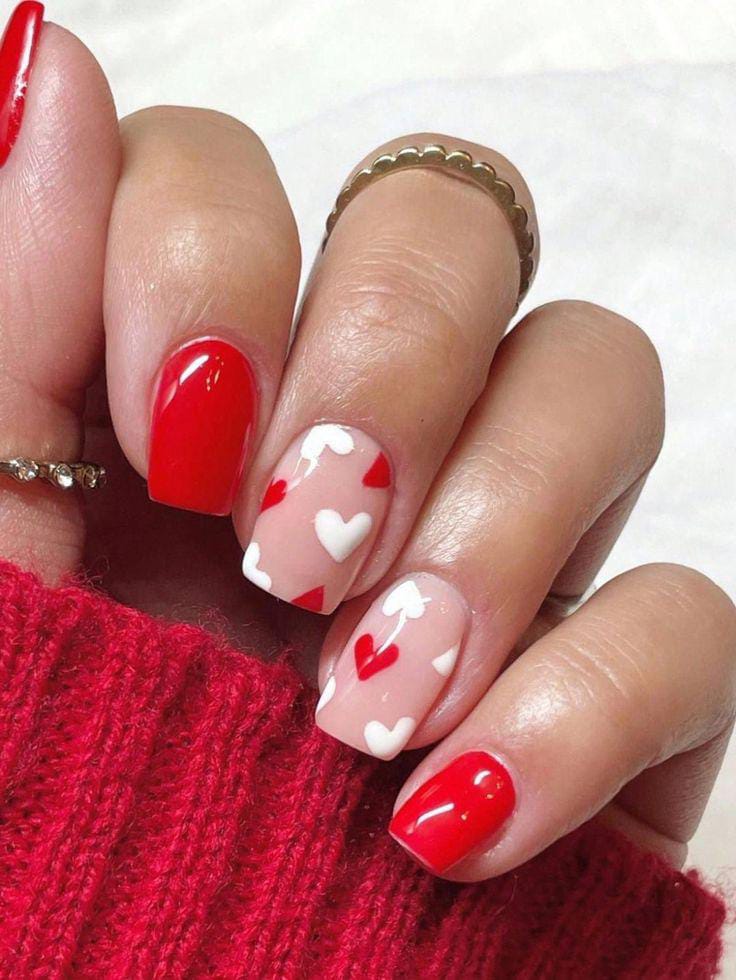 Glossy red nails mix with soft nude nails decorated in scattered red and white hearts, creating a bold yet sweet Valentine’s combo. It feels simple, lively, and full of charm.