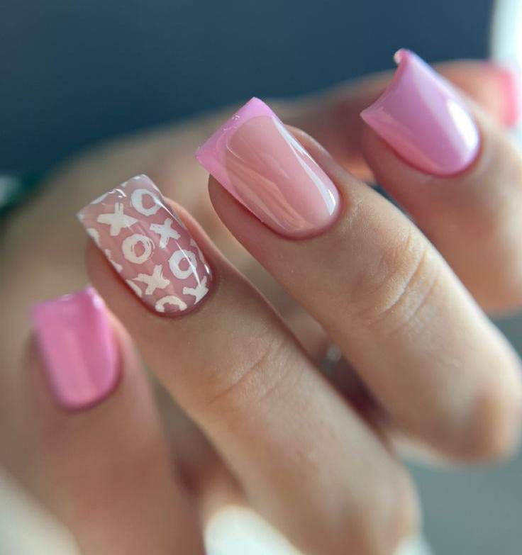 A playful mix of bright pink nails and a sheer accent nail covered in white “XOXO” lettering creates a fun, flirty Valentine vibe. It’s cute, minimal, and perfect if you want something sweet but not too bold.