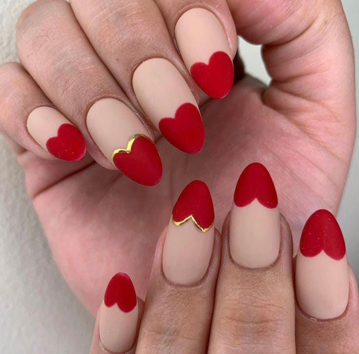 A nude matte base paired with red heart-shaped French tips gives this design a modern, artistic Valentine twist. The tiny gold detail on a few nails adds a soft, luxe touch without overpowering the look.
