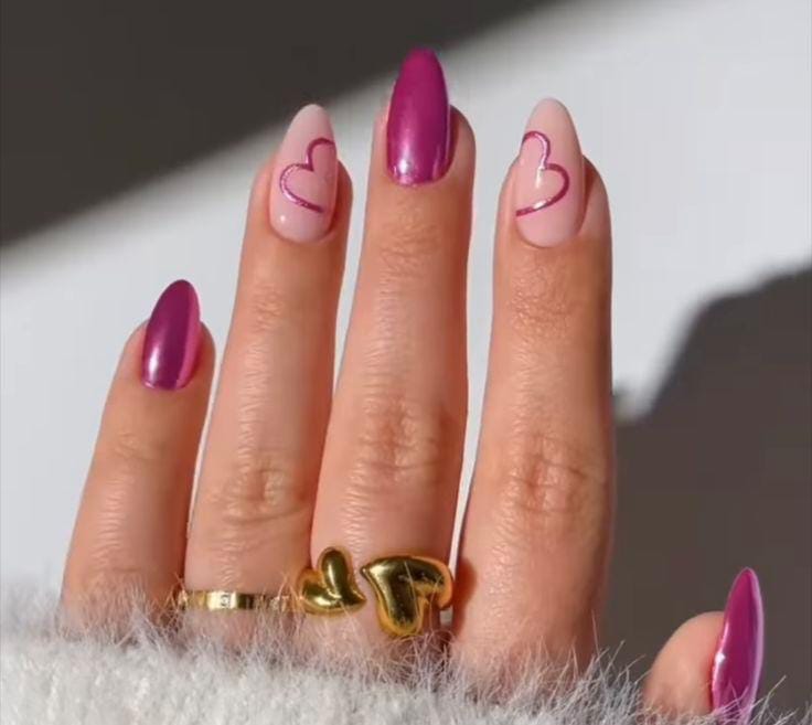 Shimmery magenta nails mixed with soft pink nails outlined with metallic heart shapes create a stylish, simple Valentine’s look with a girly touch.