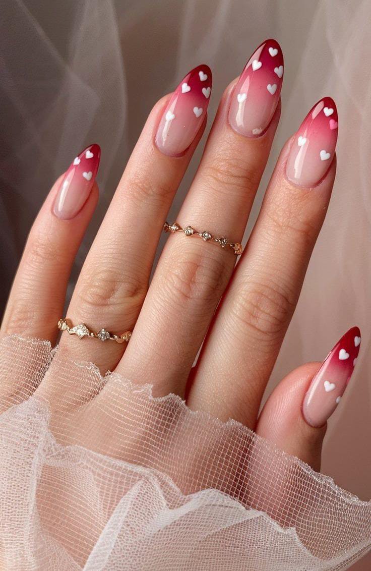 A pink-to-red ombre fade sprinkled with tiny white hearts creates a dreamy, romantic aesthetic. It’s soft, feminine, and perfect for anyone who loves a simple Valentine’s-themed style.