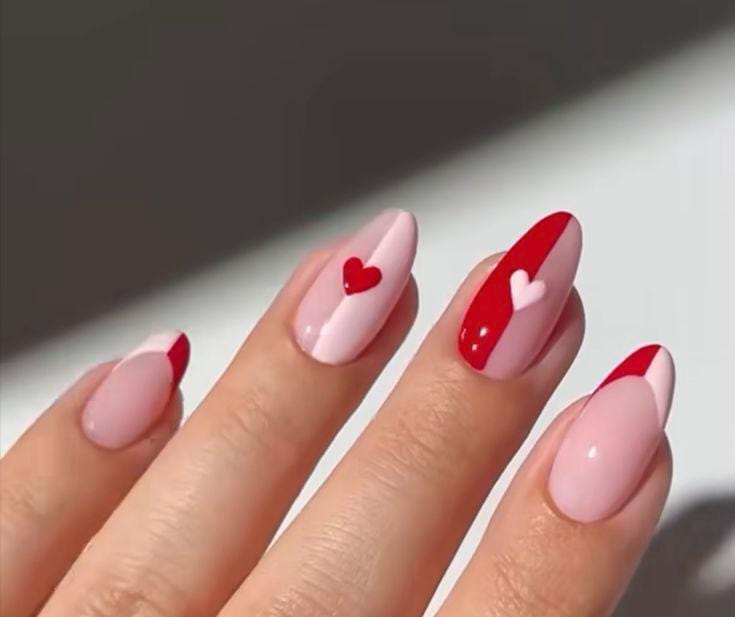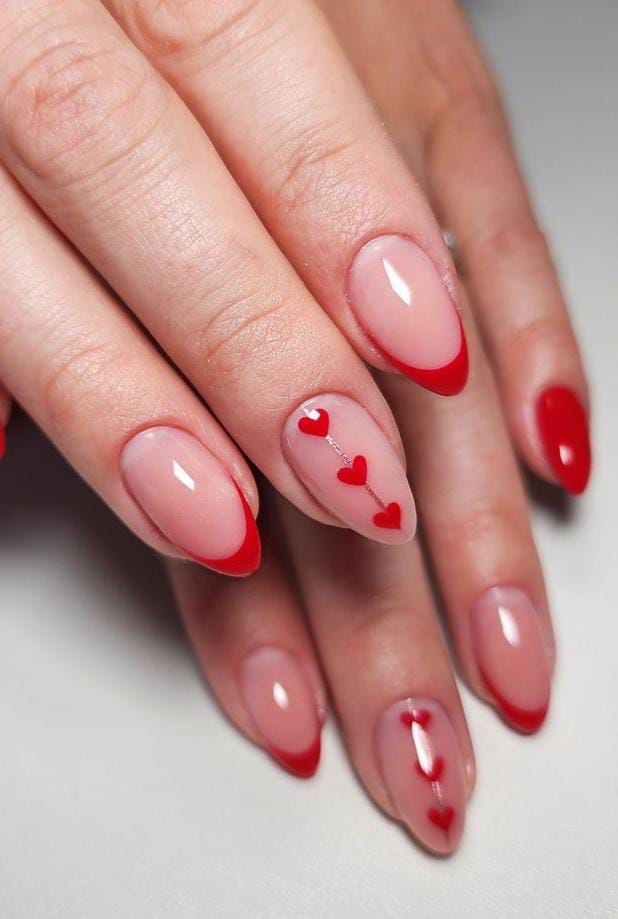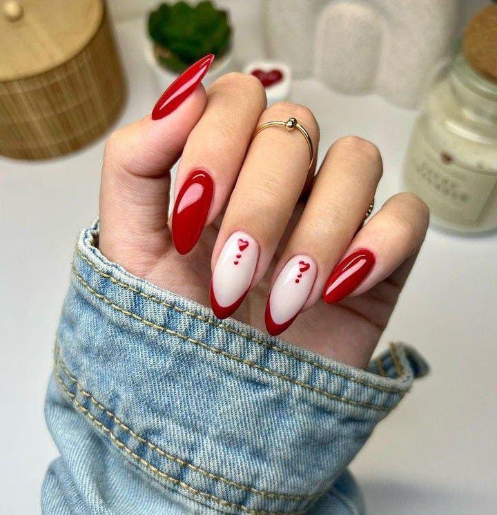 Glossy red nails contrast with soft nude ones featuring tiny hearts and red french tips, creating a cute and simple love- Valentine’s themed style.