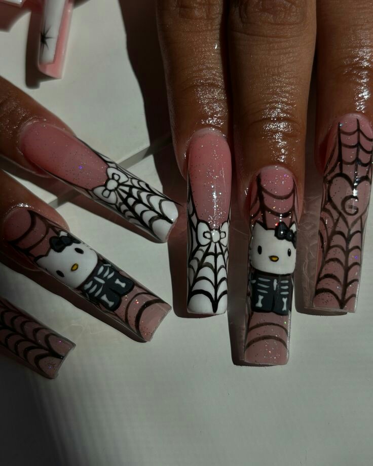 Long pink acrylics with bow spiderwebs and little Hello Kitty skeleton designs balance creepy and cute in a playful, glittery style.
