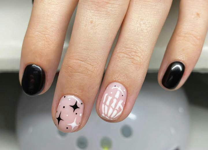 Soft pink nails with white skeleton-inspired accents, paired with glossy black for a simple but spooky-chic vibe.