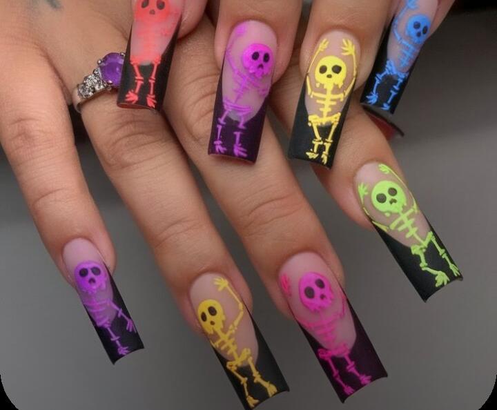 Vibrant neon skeletons pop against a matte black french tips, giving off a glowing, rave-ready Halloween energy.