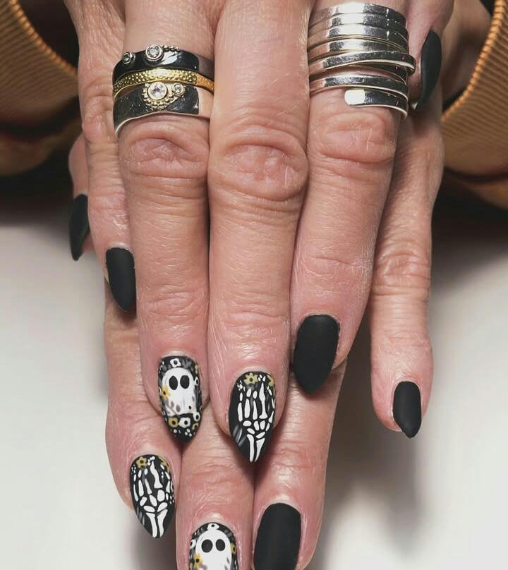 Matte black nails accented with white skeleton hands and ghosts, finished with delicate floral touches for a spooky yet classy style.