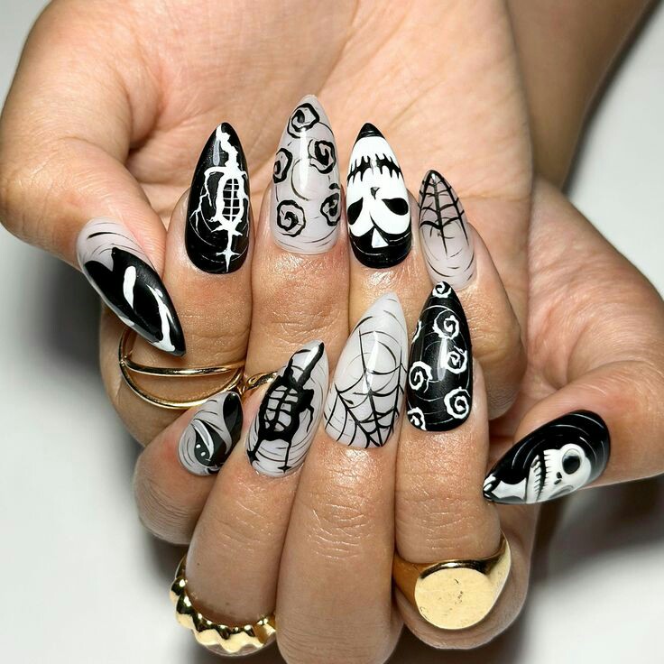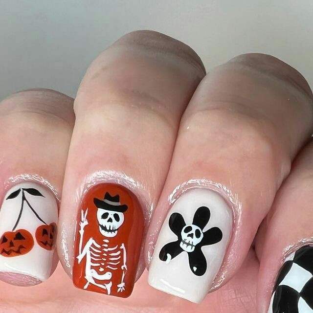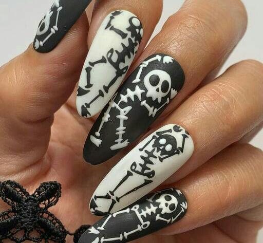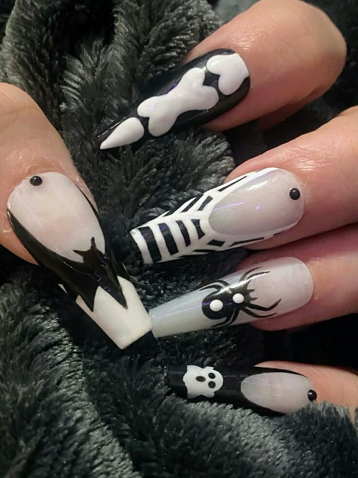 A mix of skeletons, skull faces, and spiderwebs in black and white give these nails a spooky yet playful Halloween feel.