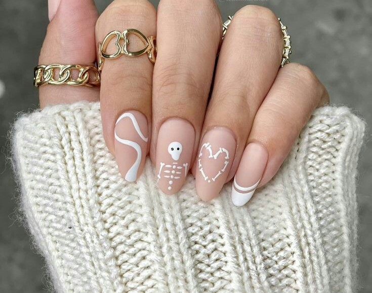 A soft nude base with delicate white skeleton and bone-herat, offering cute and spooky nails.
