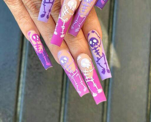 Bold square nails with a purple-to-pink french tips and playful skeleton sketches give off a fun, edgy Halloween feel.