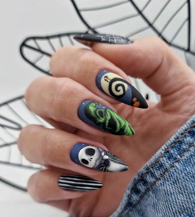 Stiletto-shaped nails inspired by The Nightmare Before Christmas, mixing moonlit skies, Jack Skellington, and Oogie Boogie in a hand-painted look.