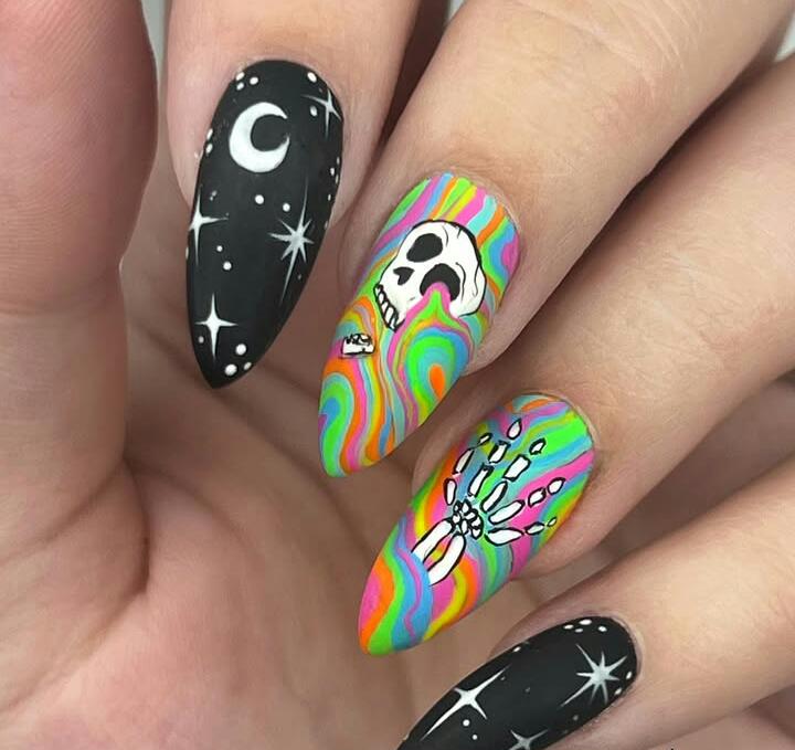 A mix of black starry skies and neon rainbow swirls with skeleton art, blending trippy colors with a gothic edge.