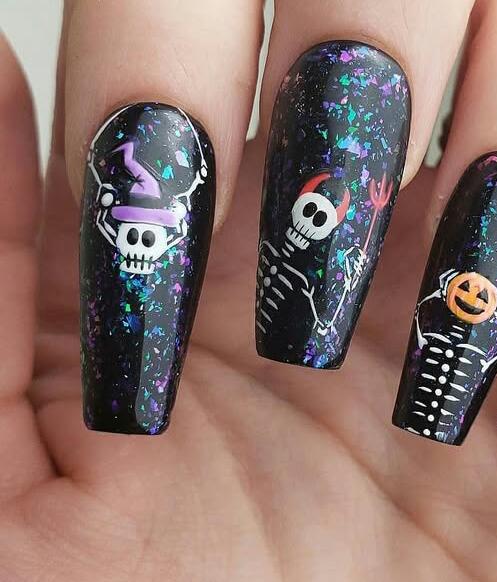 A fun Halloween-inspired look featuring cartoon skeletons with festive accessories on a dark, glittery black base that sparkles with hints of purple and blue.