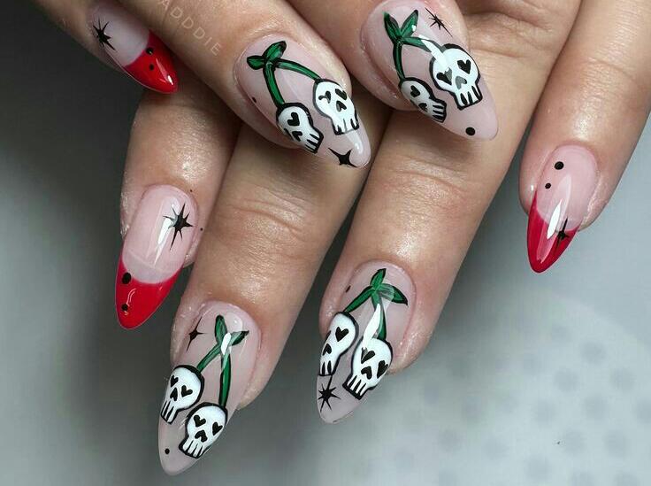 Edgy nude nails with bold skull cherries, red tips, and star accents for a gothic-meets-playful vibe.