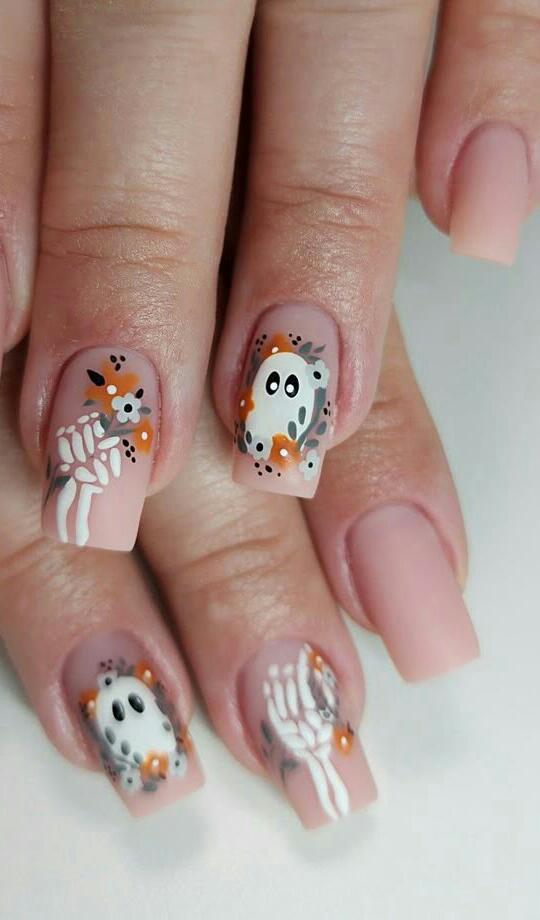 Soft matte nails featuring cute skeleton hands and tiny ghosts surrounded by delicate floral accents.