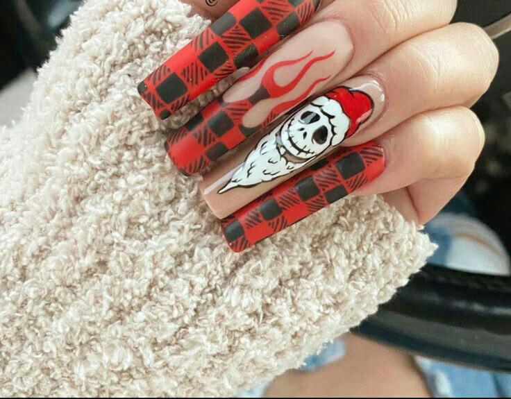 Long square nails with red-and-black plaid, flames, and a Santa skull design for a spooky holiday twist.