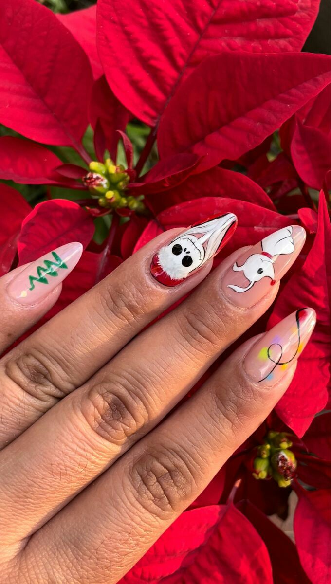 Minimal nude nails with festive Christmas elements, featuring a Santa skull and ghostly character.