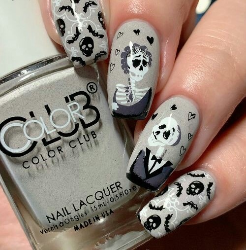 Grey-toned nails showcasing skeleton figures, skulls, bats, and tiny hearts for a dark romantic aesthetic.
