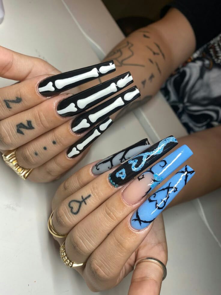 Long black nails with bold white bone designs paired with blue accents and abstract skeleton-inspired patterns for a modern edge.