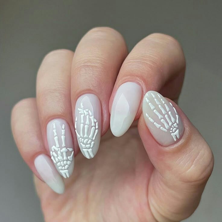 Minimal nude nails featuring raised white skeleton hand designs, giving a subtle but eerie 3D effect.