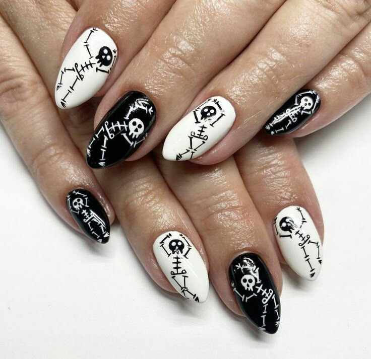 Black and white nails with cute stick-figure skeletons, creating a fun and quirky Halloween design.