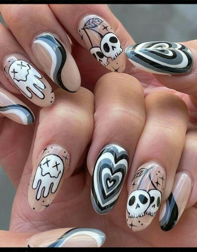 Soft nude nails with abstract black-and-white skulls, ghost drips, and swirls for a trendy, artsy look.