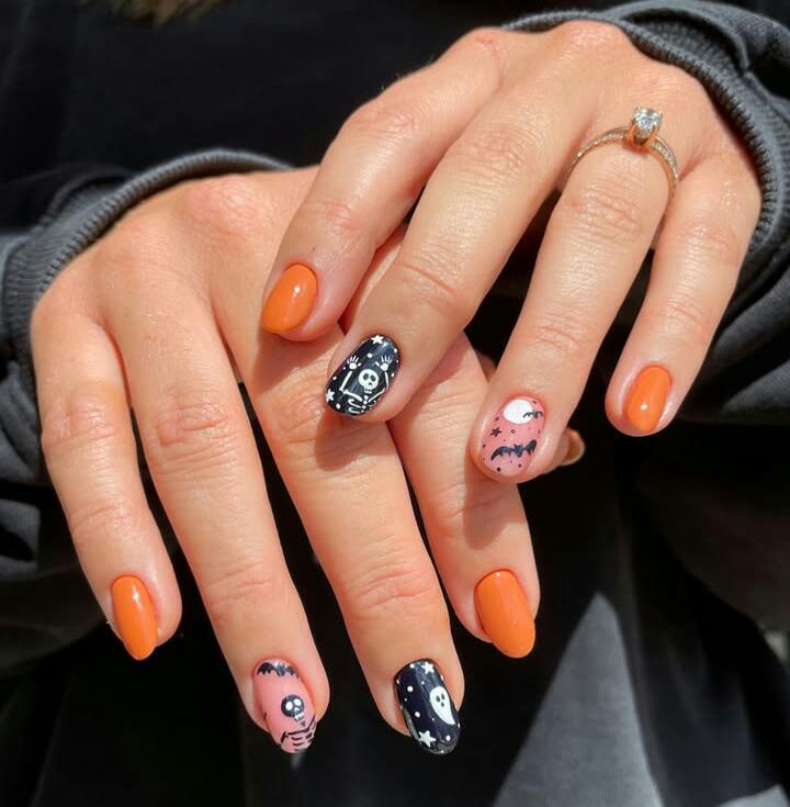 Bright orange nails paired with spooky skeletons, bats, and moons for a fun Halloween feel.