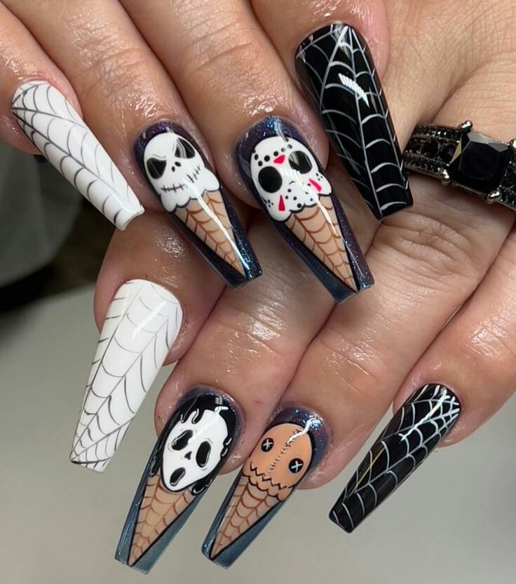 A playful Halloween mix with ghostly skeleton faces styled as ice cream scoops, paired with black and white spiderwebs for a fun yet creepy vibe.