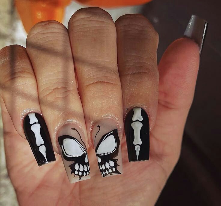 A darker design with black and nude nails featuring white bones and butterfly skull faces, giving off a gothic skeleton aesthetic.