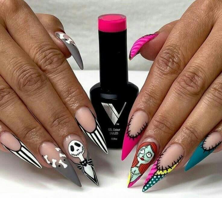 Pointed nails with bright pops of pink, teal, and black, featuring cartoonish skeleton characters that feel both spooky and quirky.