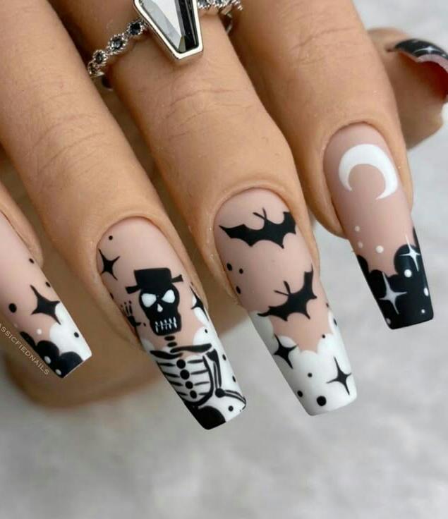 Matte nude coffin nails with black and white cloud like tips with skeletons, bats, moons, and clouds in black and white for a dark, eerie aesthetic.