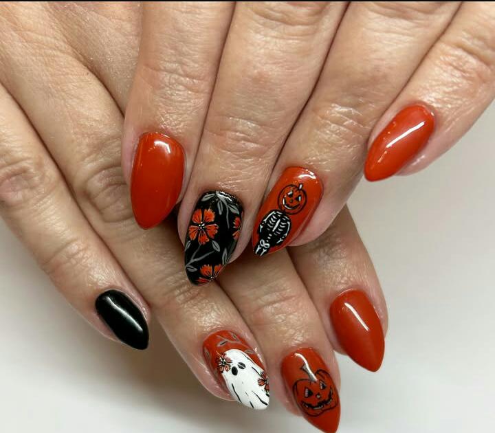 Warm orange and black nails with ghosts, pumpkins, and skeletons, and flowers blending classic Halloween colors with a festive charm.
