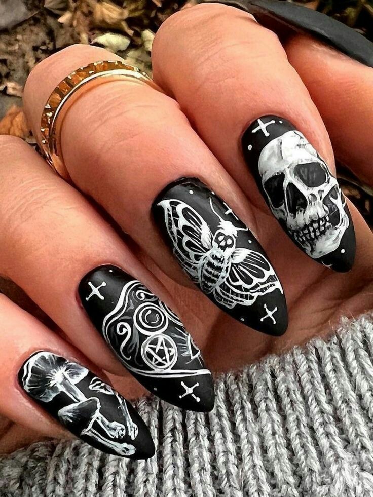 Matte black nails with intricate white skulls, moths, mushrooms, and occult-inspired symbols create a moody gothic vibe.