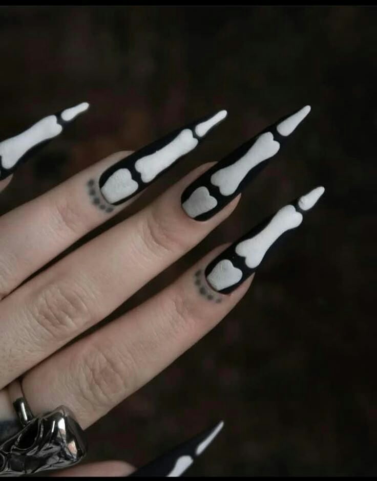 Sharp black nails painted with bold white bone patterns mimic skeletal hands for a dramatic 3D effect.