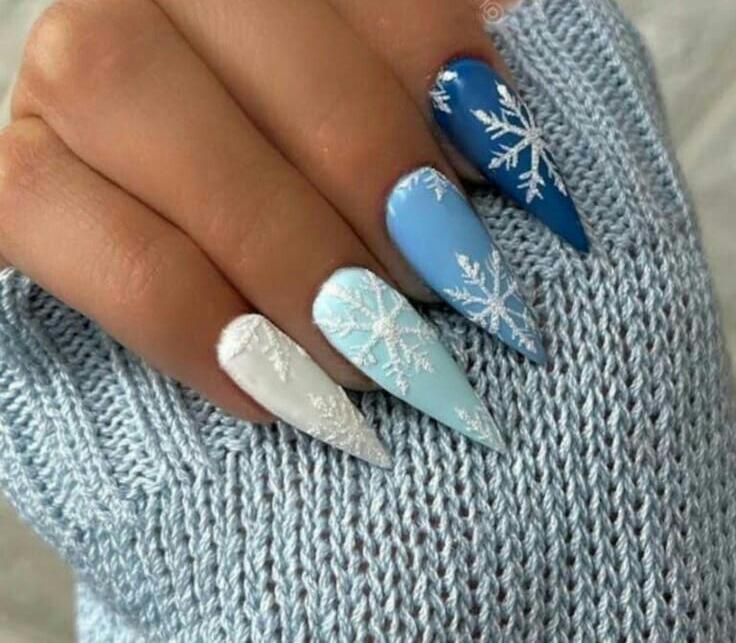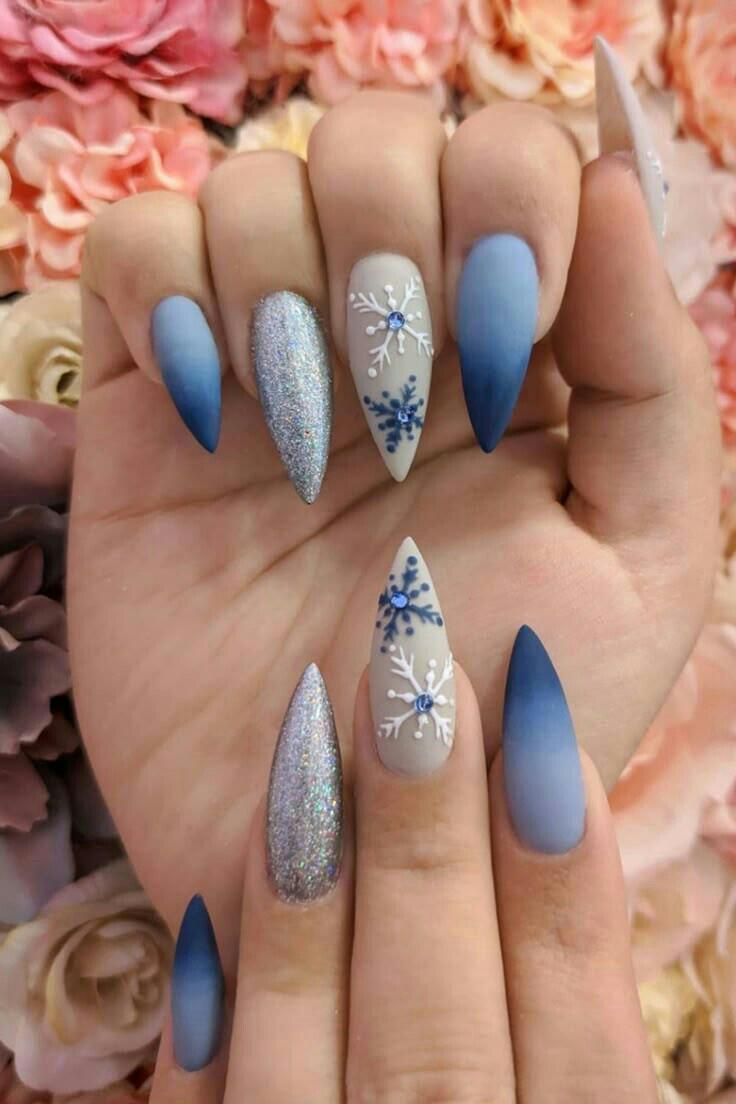 These long, pointed nails blend frosty blue ombré with glitter accents and intricate snowflakes. The added rhinestones create a glamorous, winter-fairytale aesthetic.