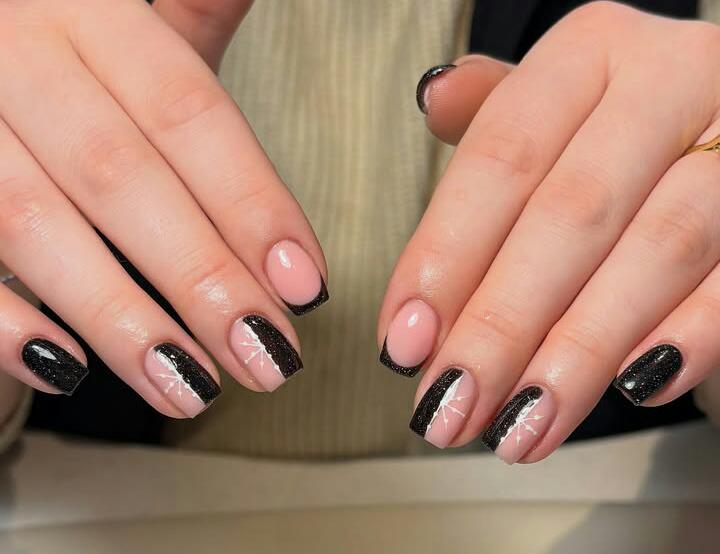 A mix of glossy nude nails and black glitter French tips, accented with clean white snowflake lines. It has a chic, minimalist winter aesthetic with a touch of sparkle.