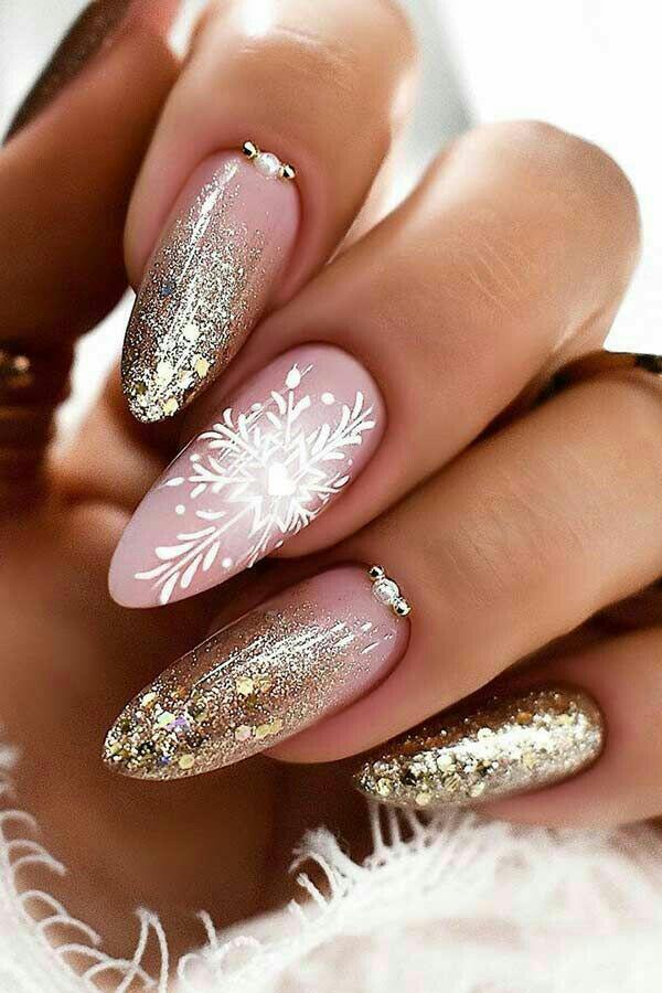 A blend of nude-pink polish and gold glitter creates a warm, glowing winter look, highlighted by a beautifully detailed white snowflake accent nail. It’s classy, refined, and perfect for a sophisticated holiday vibe.