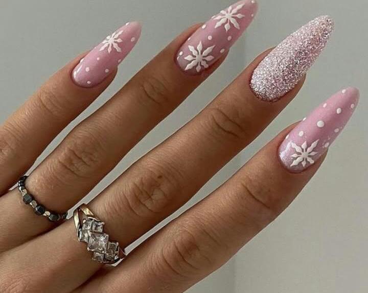 Soft pink and white nails are paired with subtle glitter and dainty snowflake patterns. The look is sweet, cozy, and feminine, with a frosted, fairy-tale winter charm.