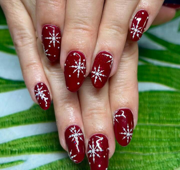 Deep burgundy nails are decorated with crisp white snowflakes and soft snowfall dots, creating a bold and festive winter look. The contrast is striking and gives the design a rich, seasonal charm.