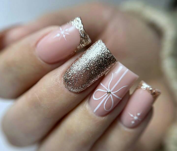 This design mixes soft nude tones with bold metallic gold accents, creating a glamorous winter look. With glittery gold nails and delicate white ribbon-style line art, it feels festive, elegant, and perfect for holiday celebrations.