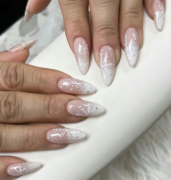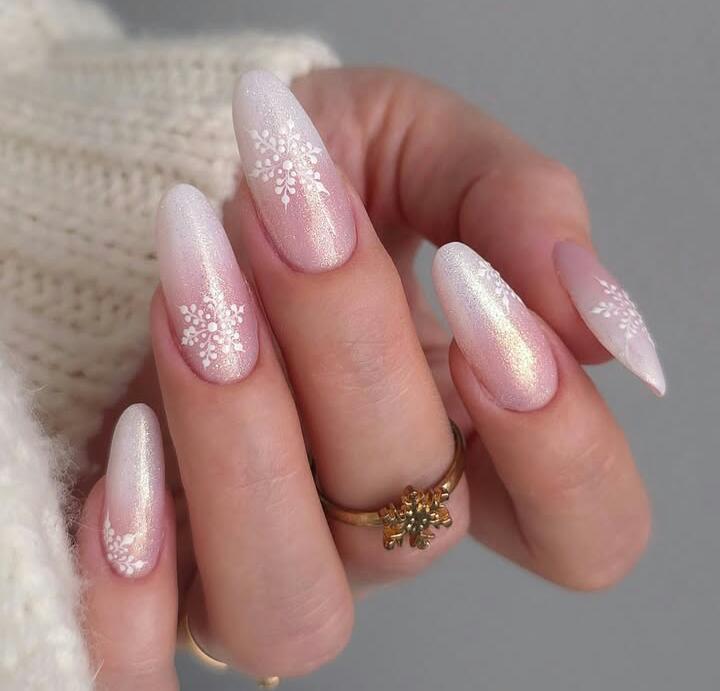 These nails feature a dreamy pink-to-white ombré with a pearly sheen, giving them a soft, frosted appearance. The small, intricate white snowflakes add a gentle winter touch that’s subtle yet beautifully seasonal.