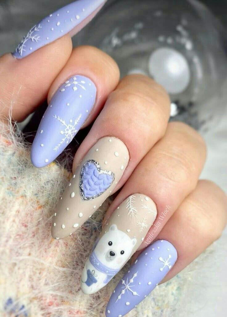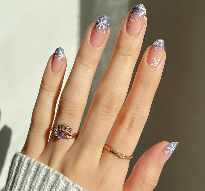 Clear nude nails with lavender-sparkle tips and soft white snowflakes give this design a delicate, frosty look. It’s light, airy, and perfect for a refined winter style.