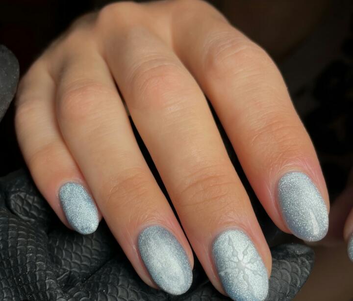 This design uses a cool, shimmering silver polish with a subtle snowflake design that looks like fresh frost on a cold morning. Simple, smooth, and elegant, it gives a modern winter feel without any heavy patterns.