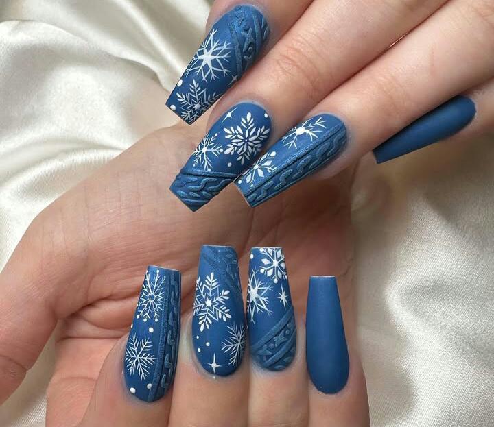 These matte cobalt-blue nails mix bold snowflake art with raised sweater-knit patterns. The combination feels warm and wintry, like a stylish knit sweater translated into nail art.