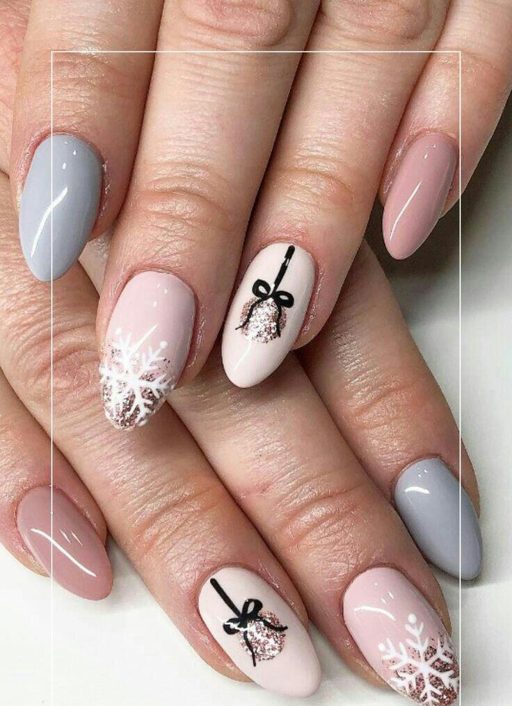 Soft neutrals and pastel gray come together with delicate snowflakes and cute ornament designs for a sweet holiday look. The mix of minimal nails and detailed accent art keeps it classy with just the right amount of festive flair.