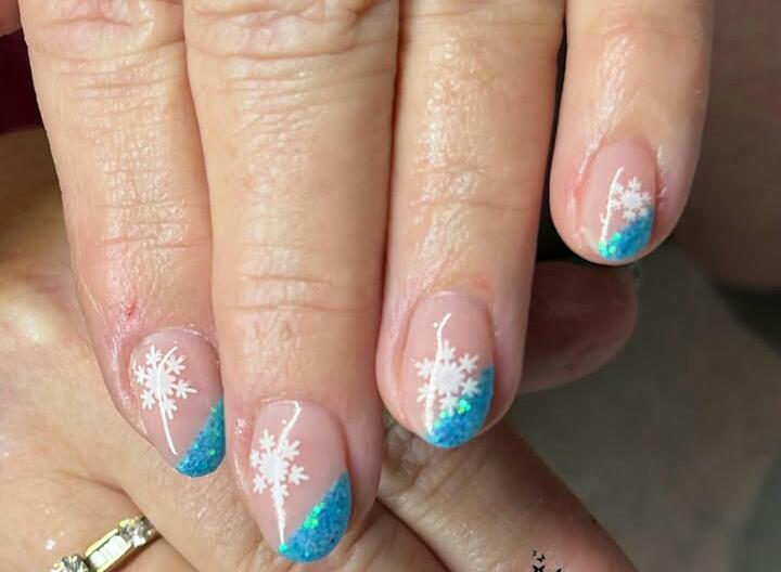 This look features soft nude nails paired with bright, glittery blue diagonal tips. White snowflakes add a delicate wintery touch, giving the design a crisp and cheerful seasonal vibe.