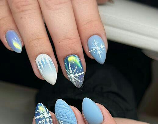 This set blends icy blues with a mix of matte and shimmering finishes, topped with bold white snowflakes. The gradient accents and knitted-texture nail give it a frosty yet playful winter aesthetic.